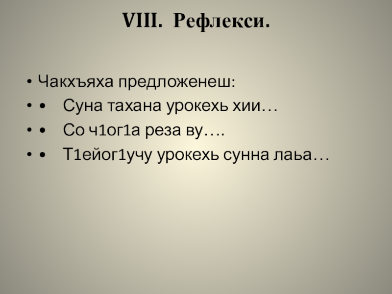 VIII. Рефлекси. Чакхъяха предложенеш:•	Суна тахана урокехь хии…•	Со ч1ог1а реза ву….•	Т1ейог1учу урокехь сунна лаьа…