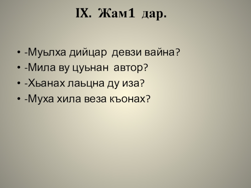 IX. Жам1 дар.	 -Муьлха дийцар девзи вайна? -Мила ву цуьнан автор?-Хьанах лаьцна ду иза?-Муха хила веза къонах?