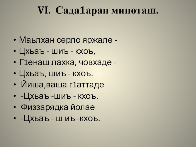 VI. Сада1аран миноташ. Маьлхан серло яржале -Цхьаъ - шиъ - кхоъ,Г1енаш лахка, човхаде -Цхьаъ, шиъ - кхоъ.