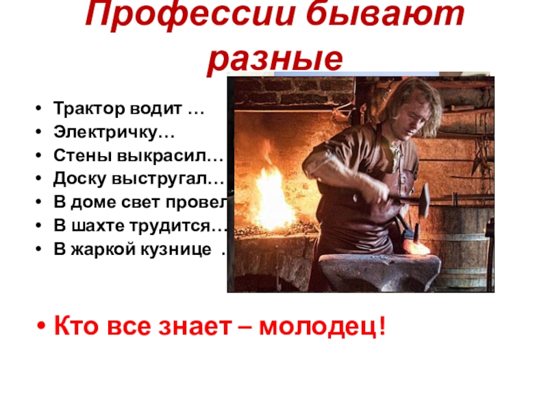 Профессии бывают разныеТрактор водит …Электричку…Стены выкрасил…Доску выстругал…В доме свет провел…В шахте трудится…В жаркой кузнице …Кто все знает