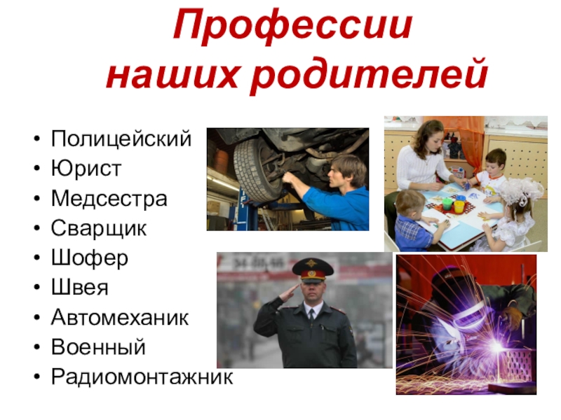 Профессии  наших родителейПолицейскийЮристМедсестраСварщикШоферШвеяАвтомеханикВоенный Радиомонтажник
