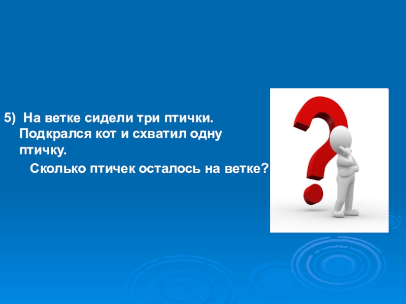 5) На ветке сидели три птички. Подкрался кот и схватил одну птичку.    Сколько птичек