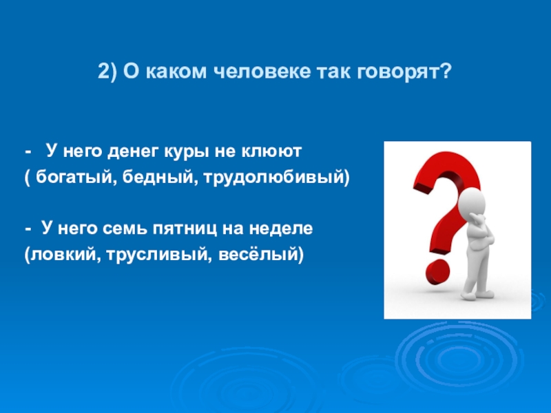 2) О каком человеке так говорят?-  У него денег куры не клюют( богатый, бедный, трудолюбивый)- У