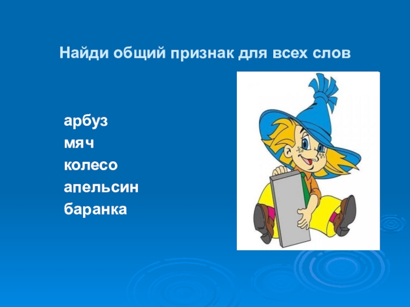 Найди общий признак для всех словарбузмячколесоапельсинбаранка