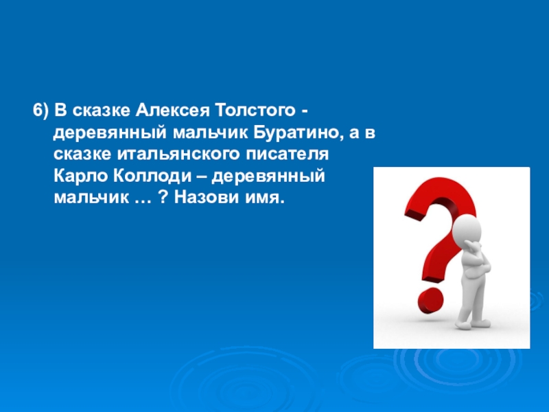 6) В сказке Алексея Толстого - деревянный мальчик Буратино, а в сказке итальянского писателя Карло Коллоди –