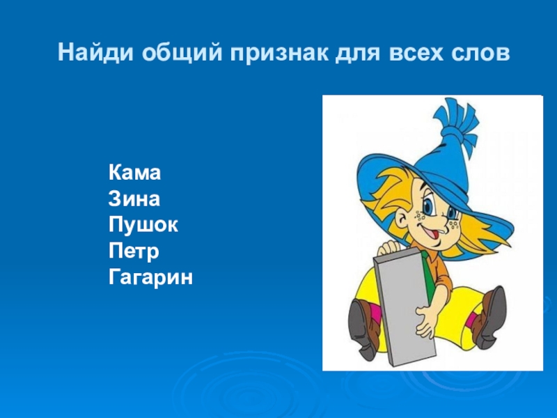 Найди общий признак для всех словКамаЗинаПушокПетр Гагарин