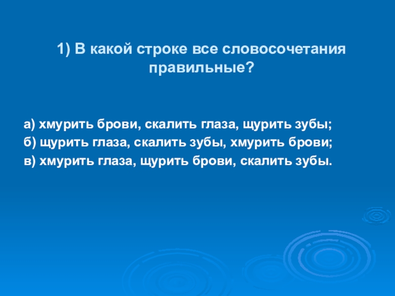 1) В какой строке все словосочетания правильные?а) хмурить брови, скалить глаза, щурить зубы;б) щурить глаза, скалить зубы,