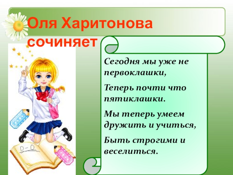 Оля Харитонова сочиняет стихиСегодня мы уже не первоклашки,Теперь почти что пятиклашки.Мы теперь умеем дружить и учиться,Быть строгими