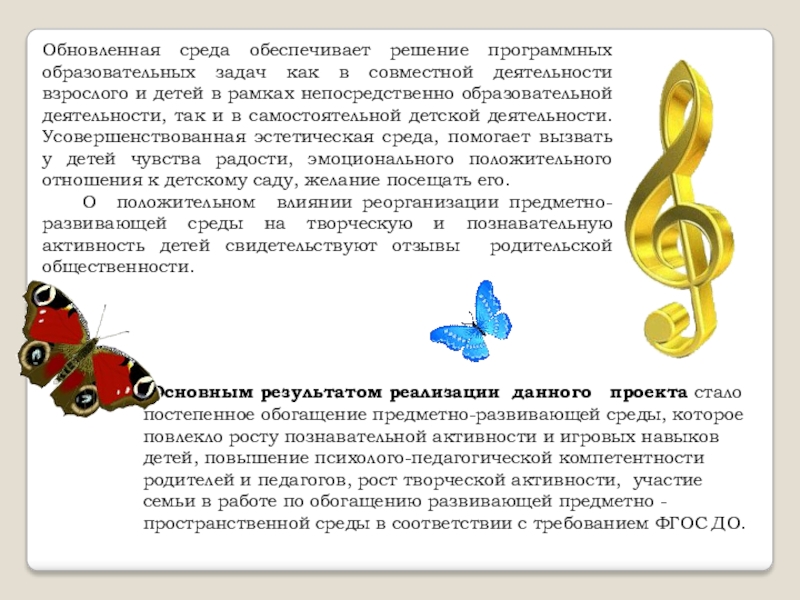 Основным результатом реализации данного проекта стало постепенное обогащение предметно-развивающей среды, которое повлекло росту познавательной активности и игровых навыков детей, повышение психолого-педагогической компетентности родителей и педагогов, рост творческой активности, участие семьи в работе по обогащению развивающей предметно - пространственной среды в соответствии с требованием ФГОС ДО.