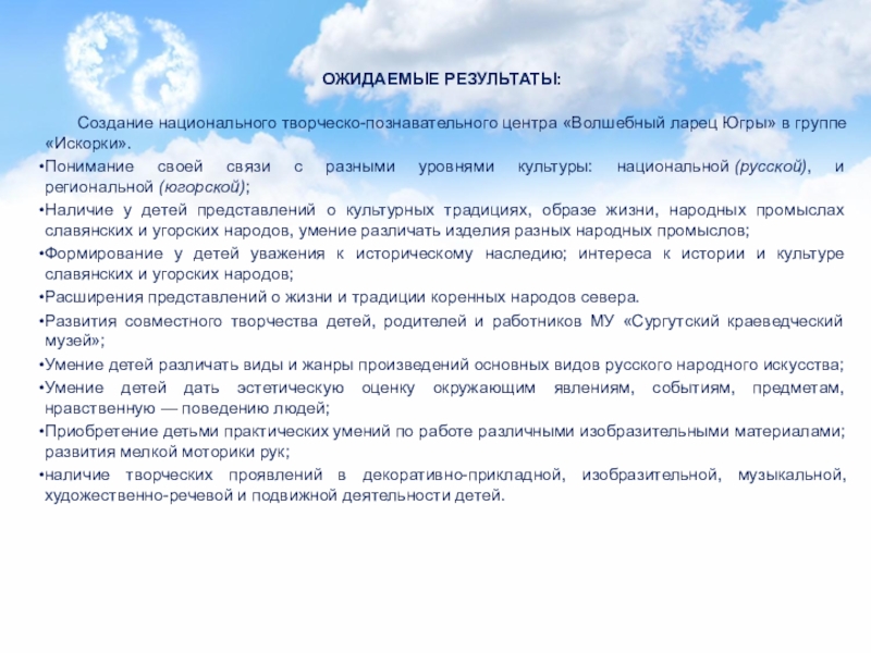 Название итогового мероприятия проекта: совместное создание познавательно-развивающего центра «Волшебный ларец Югры» в группе «Искорки».