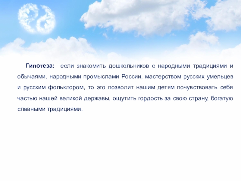 дошкольников с народными традициями и обычаями, народными промыслами России, мастерством русских умельцев и русским фольклором, то это позволит нашим детям почувствовать себя частью нашей великой державы, ощутить гордость за свою страну, богатую славными традициями.