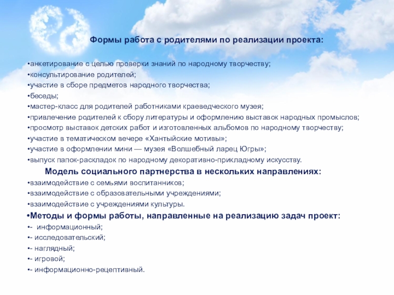 консультирование родителей, участие в сборе предметов народного творчества, беседы;