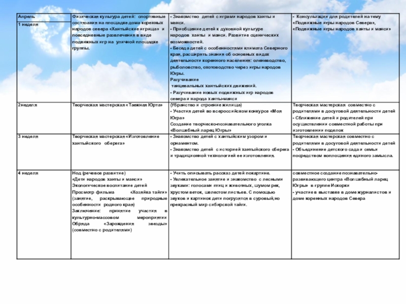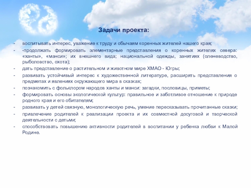 - Раскрыть особенности взаимоотношения человека и природы в представлениях коренного населения – ханты (Занятие в форме развлечения).
