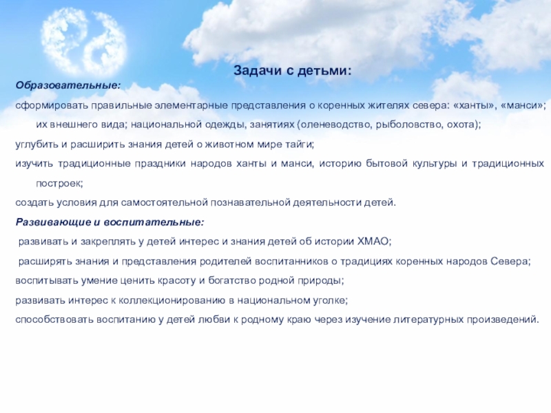 -продолжать формировать элементарные представления о коренных жителях севера: «ханты», «манси»; их внешнего вида; национальной одежды, занятиях (оленеводство, рыболовство, охота);