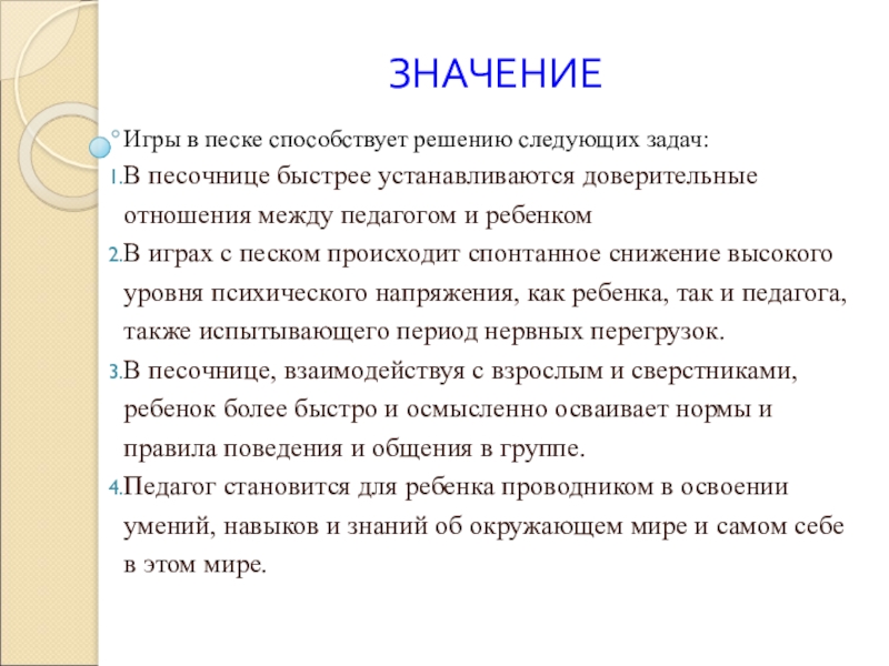 Игры в песке способствует решению следующих задач: