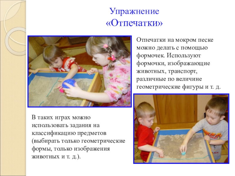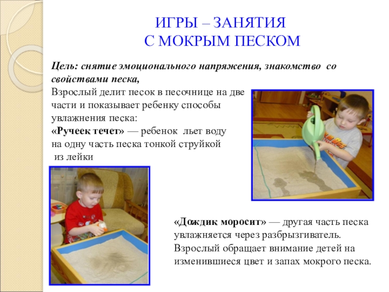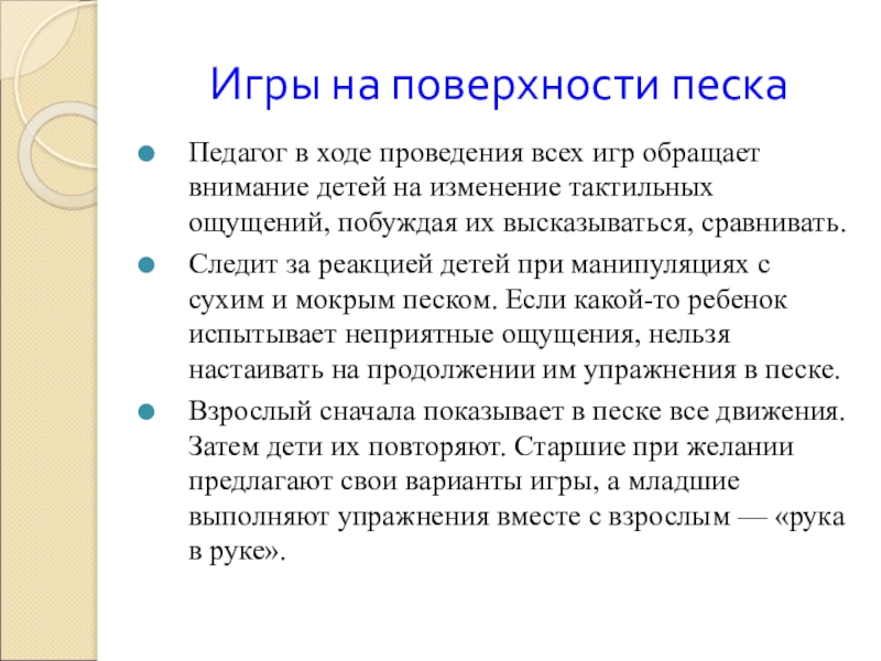 Следит за реакцией детей при манипуляциях с сухим и мокрым песком. Если какой-то ребенок испытывает неприятные ощущения, нельзя настаивать на продолжении им упражнения в песке.