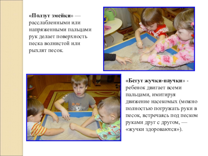 Слайд 20«Ползут змейки» — расслабленными или напряженными пальцами рук делает поверхность песка