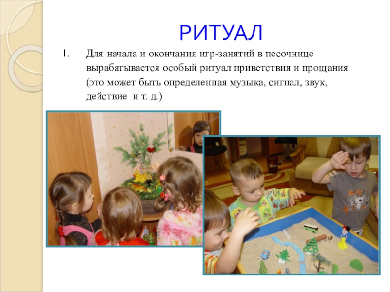 Для начала и окончания игр-занятий в песочнице вырабатывается особый ритуал приветствия
