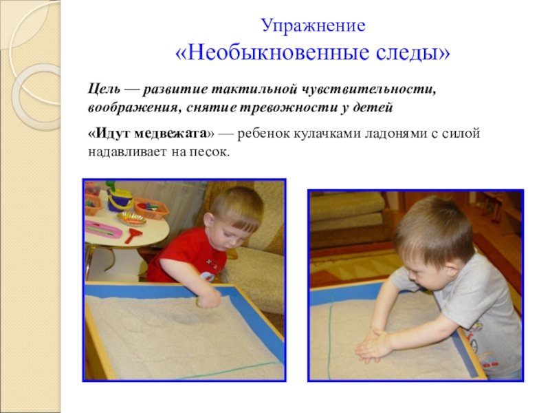 медвежата» — ребенок кулачками ладонями с силой надавливает на песок.