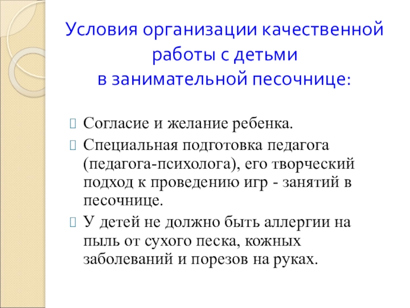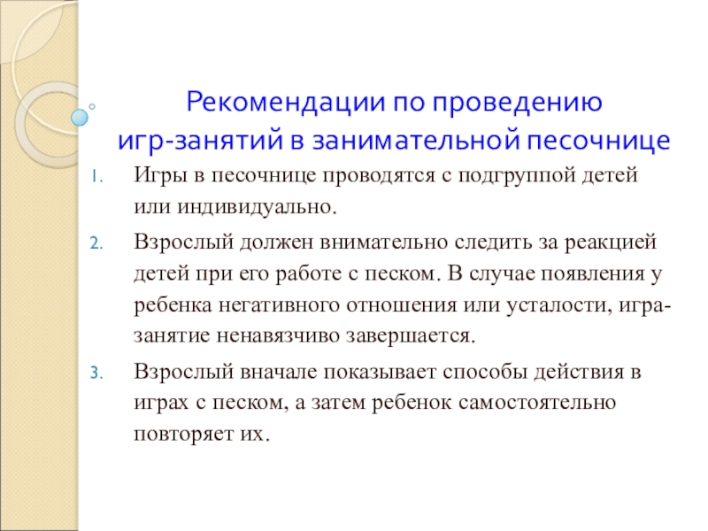 Взрослый должен внимательно следить за реакцией детей при его работе с песком. В случае появления у ребенка негативного отношения или усталости, игра-занятие ненавязчиво завершается.