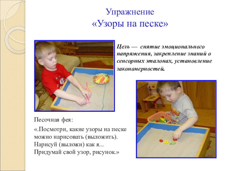«.Посмотри, какие узоры на песке можно нарисовать (выложить). Нарисуй (выложи) как я... Придумай свой узор, рисунок.»