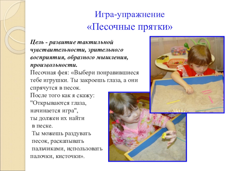Песочная фея: «Выбери понравившиеся тебе игрушки. Ты закроешь глаза, а они спрячутся в песок.