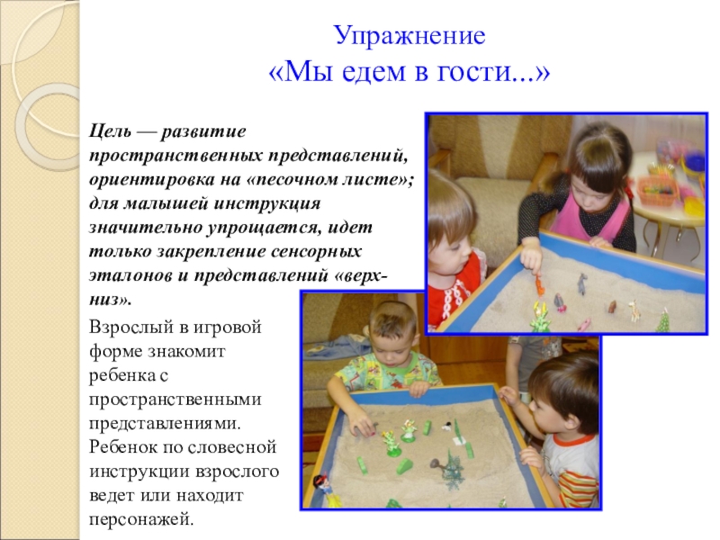 «песочном листе»; для малышей инструкция значительно упрощается, идет только закрепление сенсорных эталонов и представлений «верх-низ».
