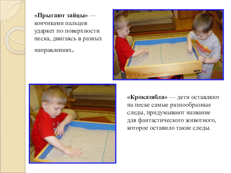 Слайд 21«Прыгают зайцы» — кончиками пальцев ударяет по поверхности песка, двигаясь в