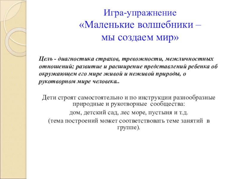 детьми, как самостоятельной так и индивидуальной, способствует: развитию эмоций, фантазии, мелкой моторики, тактильных ощущений, связной речи; наиболее эффективен в коррекции страхов, тревожности, замкнутости, агрессии, гиперактивности, межличностных взаимодействиях.