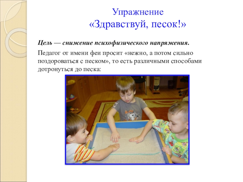 «нежно, а потом сильно поздороваться с песком», то есть различными способами дотронуться до песка:
