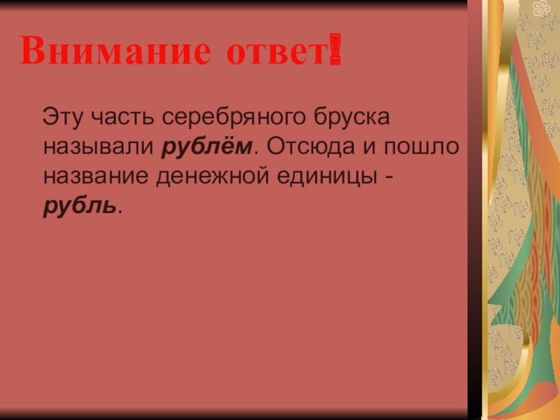 Внимание ответ!  Эту часть серебряного бруска называли рублём. Отсюда и пошло название денежной единицы - рубль.