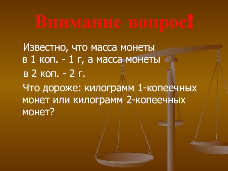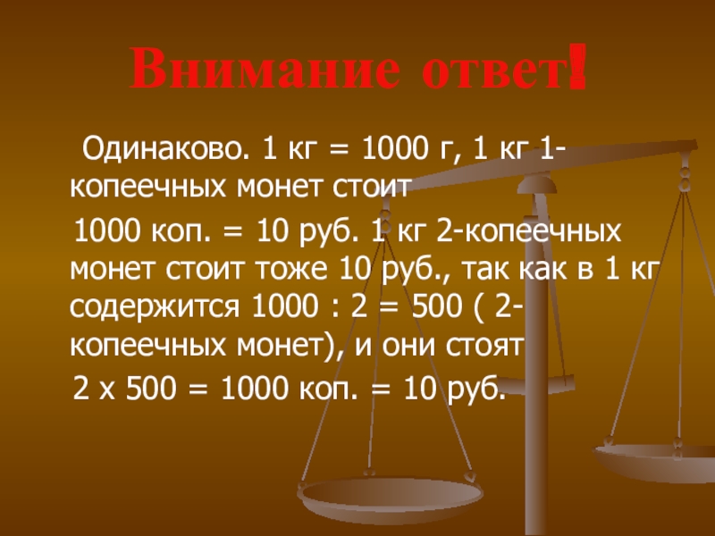 1000 коп. = 10 руб. 1 кг 2-копеечных монет стоит тоже 10 руб., так как в 1 кг содержится 1000 : 2 = 500 ( 2-копеечных монет), и они стоят