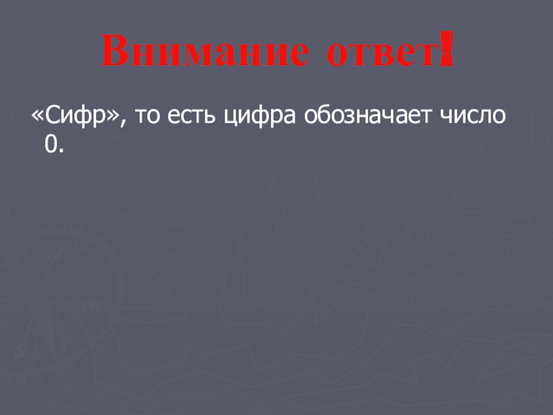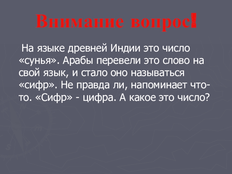 Внимание вопрос!	На языке древней Индии это число «сунья». Арабы перевели это слово на свой язык, и стало