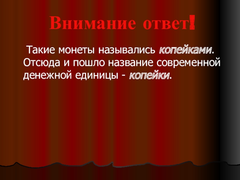 Внимание ответ!	Такие монеты назывались копейками. Отсюда и пошло название современной денежной единицы - копейки.