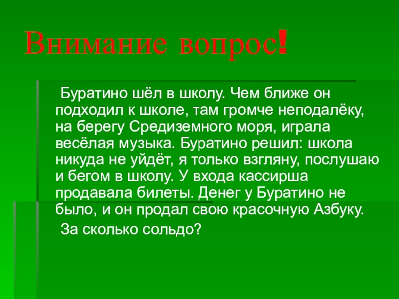 Внимание вопрос!	Буратино шёл в школу. Чем ближе он подходил к школе, там громче неподалёку, на берегу Средиземного