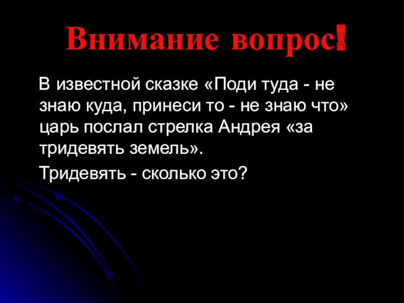 Внимание вопрос!  В известной сказке «Поди туда - не знаю куда, принеси то - не знаю