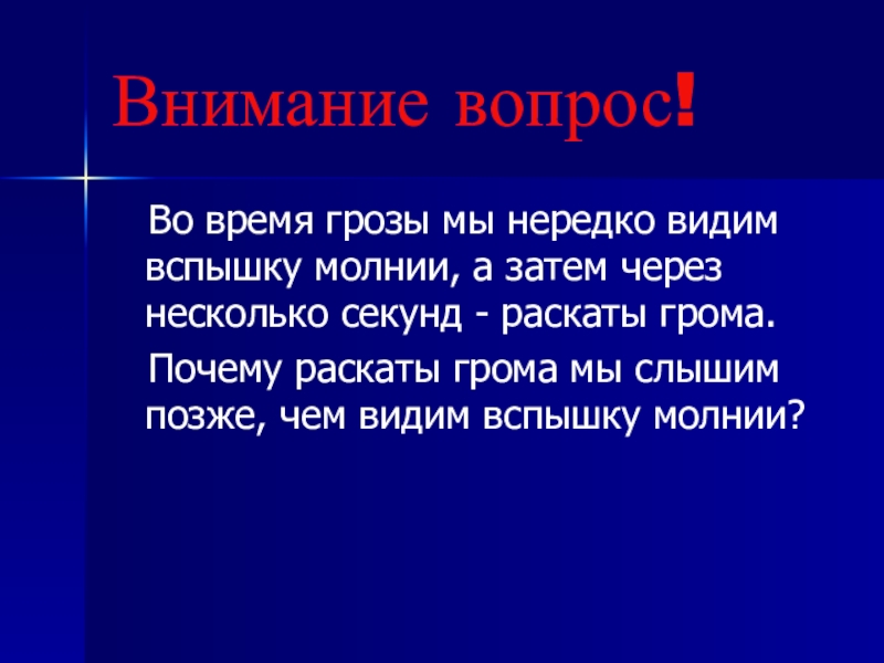 Внимание вопрос!  Во время грозы мы нередко видим вспышку молнии, а затем через несколько секунд -