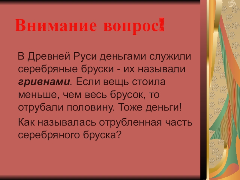 Внимание вопрос!  В Древней Руси деньгами служили серебряные бруски - их называли гривнами. Если вещь стоила