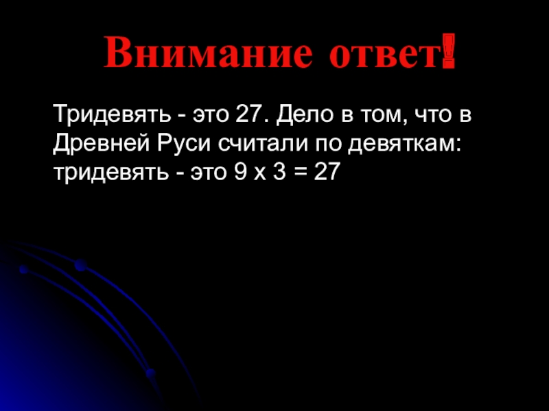 Внимание ответ!  Тридевять - это 27. Дело в том, что в Древней Руси считали по девяткам: