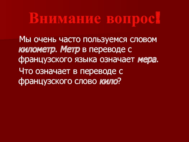 Внимание вопрос!  Мы очень часто пользуемся словом километр. Метр в переводе с французского языка означает мера.