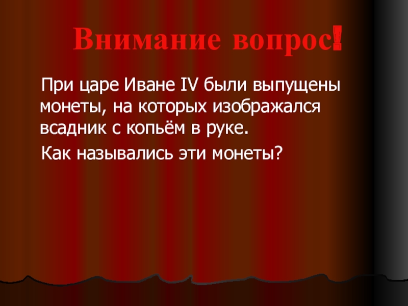 Внимание вопрос!  При царе Иване IV были выпущены монеты, на которых изображался всадник с копьём в