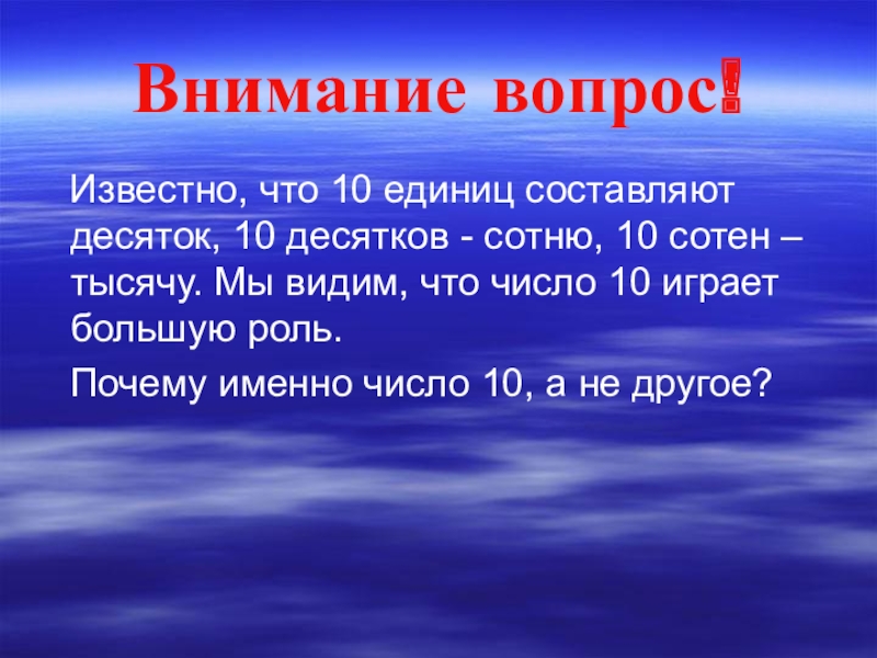 Внимание вопрос!  Известно, что 10 единиц составляют десяток, 10 десятков - сотню, 10 сотен – тысячу.