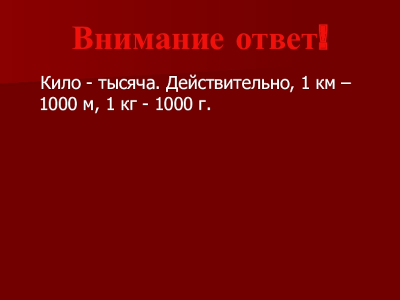 Внимание ответ!  Кило - тысяча. Действительно, 1 км – 1000 м, 1 кг - 1000 г.