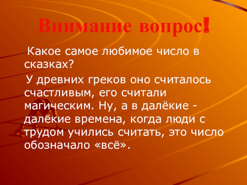 Внимание вопрос!	Какое самое любимое число в сказках?    У древних греков оно считалось счастливым, его