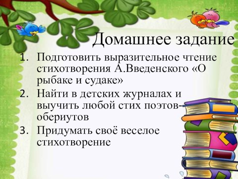 Домашнее задание Подготовить выразительное чтение стихотворения А.Введенского «О рыбаке и судаке»Найти в детских журналах и выучить любой