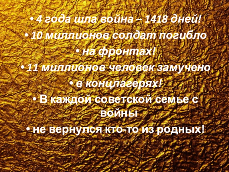 4 года шла война – 1418 дней!10 миллионов солдат погибло на фронтах!11 миллионов человек
