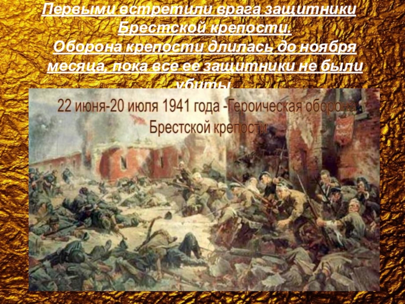 Слайд 4Первыми встретили врага защитники Брестской крепости. Оборона крепости длилась до ноября месяца,