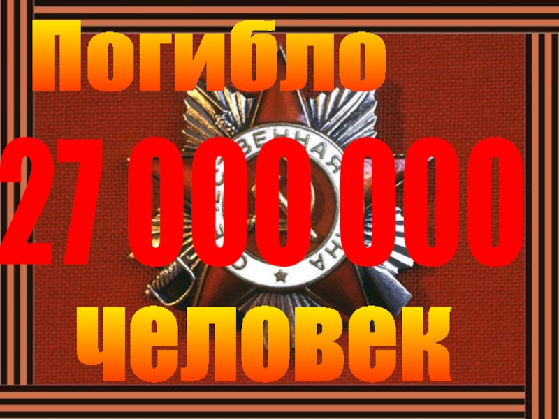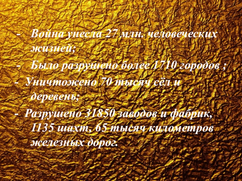 Война унесла 27 млн. человеческих жизней; Было разрушено более 1710 городов ;