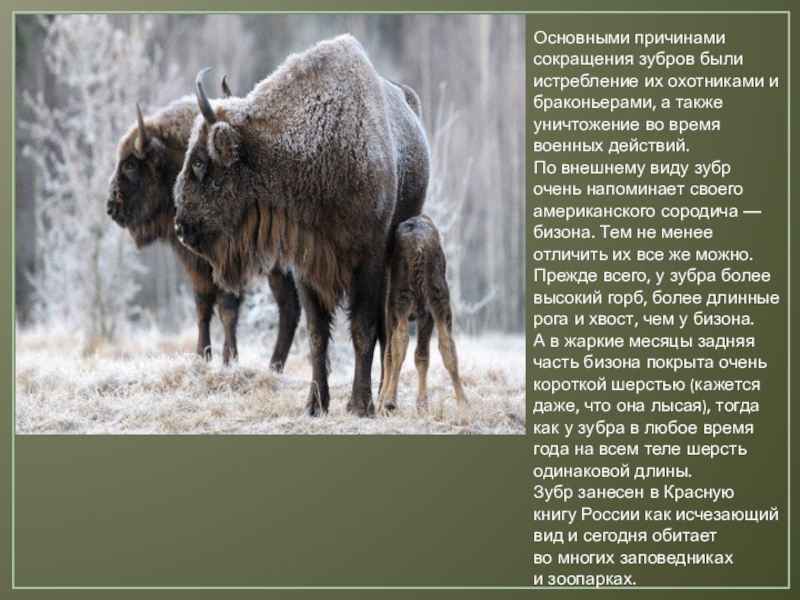 Слайд 12Основными причинами сокращения зубров были истребление их охотниками и браконьерами, а