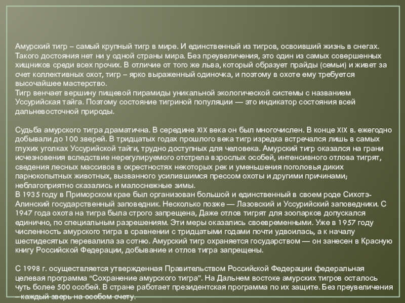 С 1998 г. осуществляется утвержденная Правительством Российcкой Федерации федеральная целевая программа “Сохранение амурского тигра”. На Дальнем востоке амурских тигров осталось чуть более 500 особей. В стране работает президентская программа по их защите. Без преувеличения – каждый зверь на особом счету.